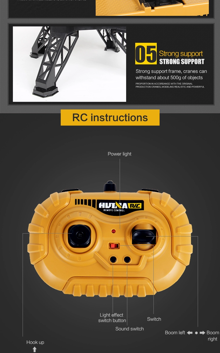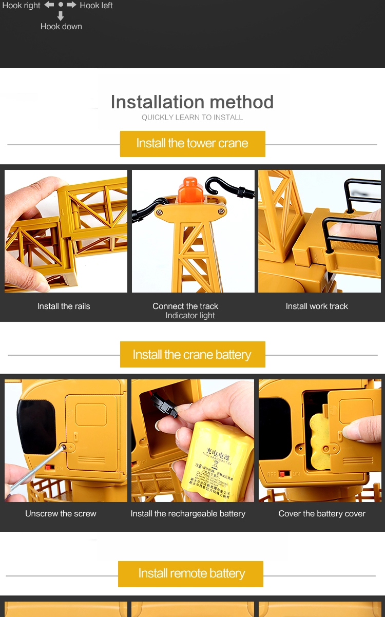 rise/fall, turn left/right, rotate,tower crane arm turn left, rotate,tower crane arm turn right, hook left shift, hook right shift, hook up and down