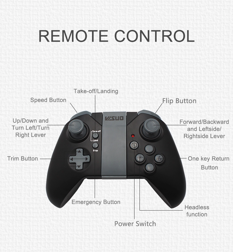 up/down, forward/backward, turn left/right, left and right side, flip, headless mode, auto return, altitude hold, gravity sensor, Altitude hold