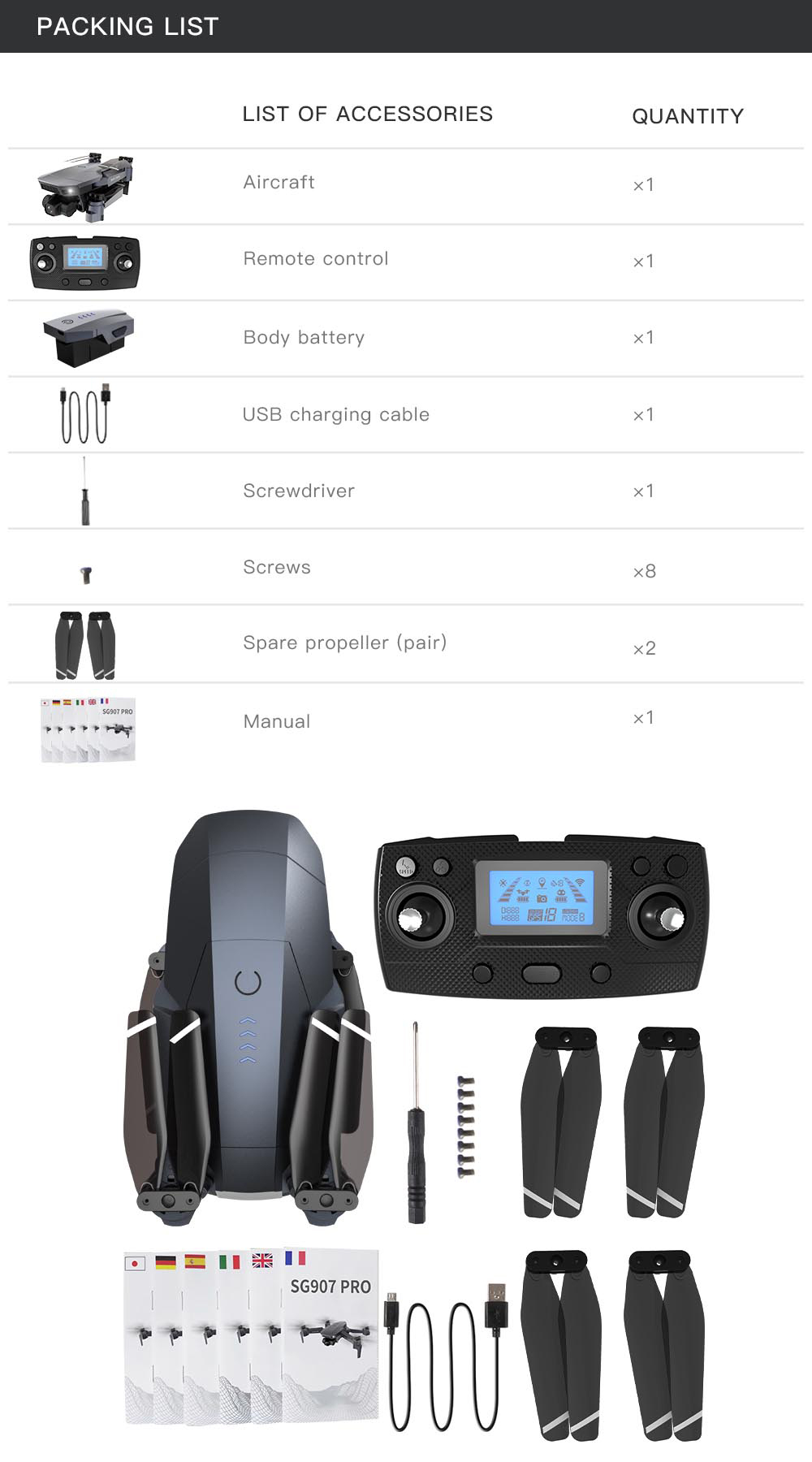 1 x Drone, 1 x USB Charger, 1 x Body battery, 1 x Screwdriver , 8 x Screws , 2 x Spare propeller(pair) , 1 x manual