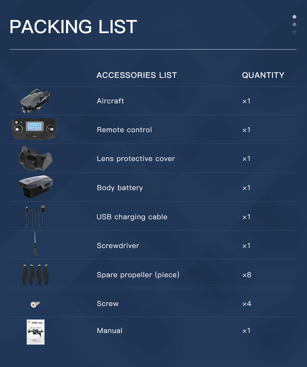 1 x Quadcopter, 1 x transmitter, 4 x Blades, 1 x USB Charger, 4 x Rubber Foot, 1 x manual