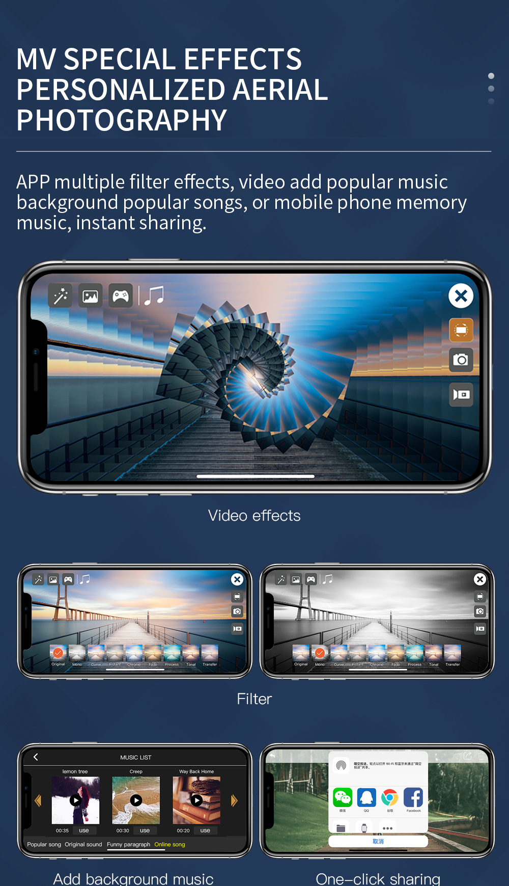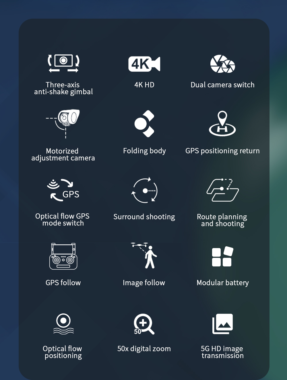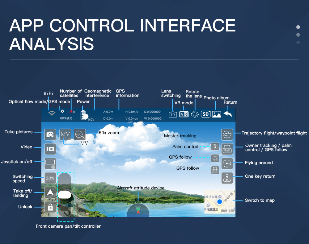 up/down, forward/backward, turn left/right, anto return, GPS positioning, follow, MV function, Gesture recognition