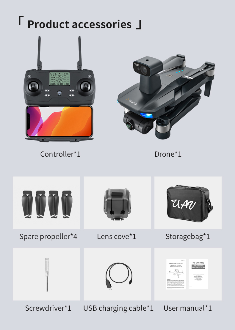 1 x Drone, 1 x Battery, 1 x Remote Control, 1 x Charger, 1 x Charging Cable,1 x English Manual