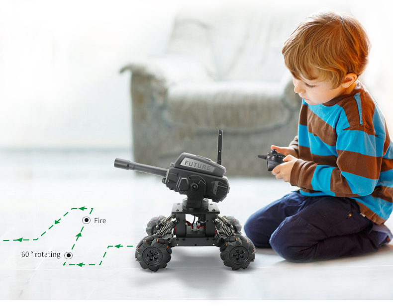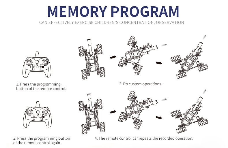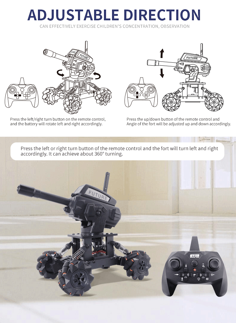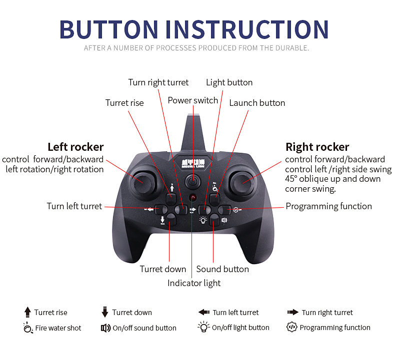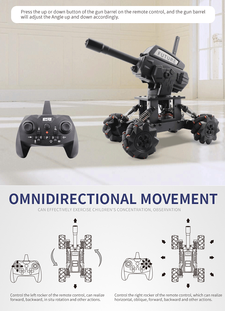 forward/backward,turn left/right,rotate,the turret rises/descends/360°rotation,shooting,with music and lights.