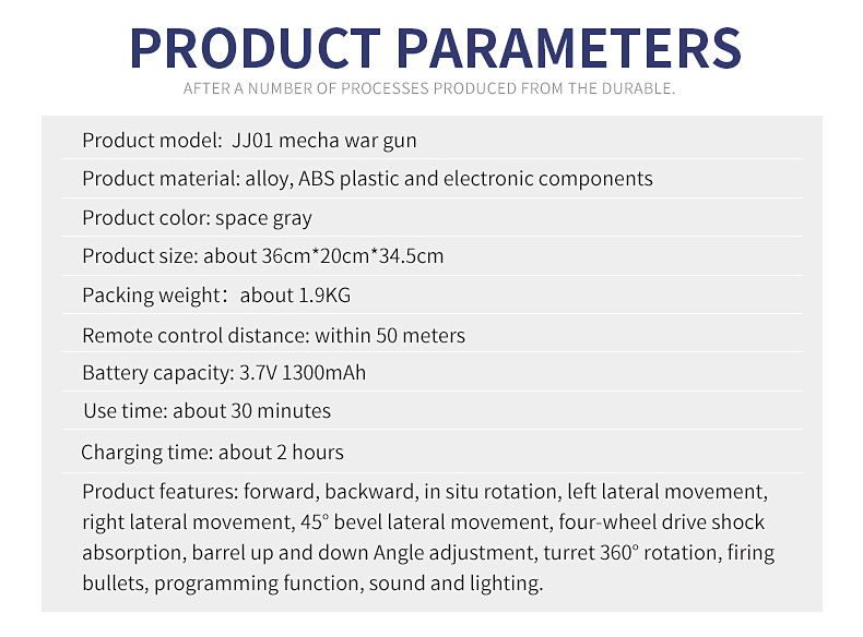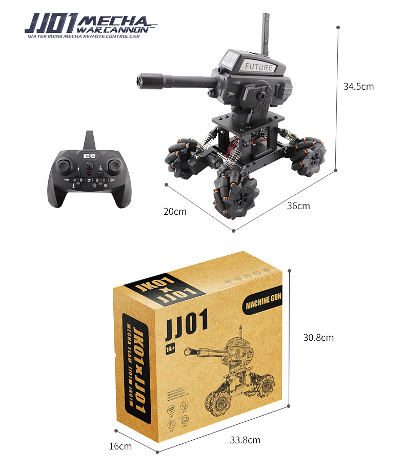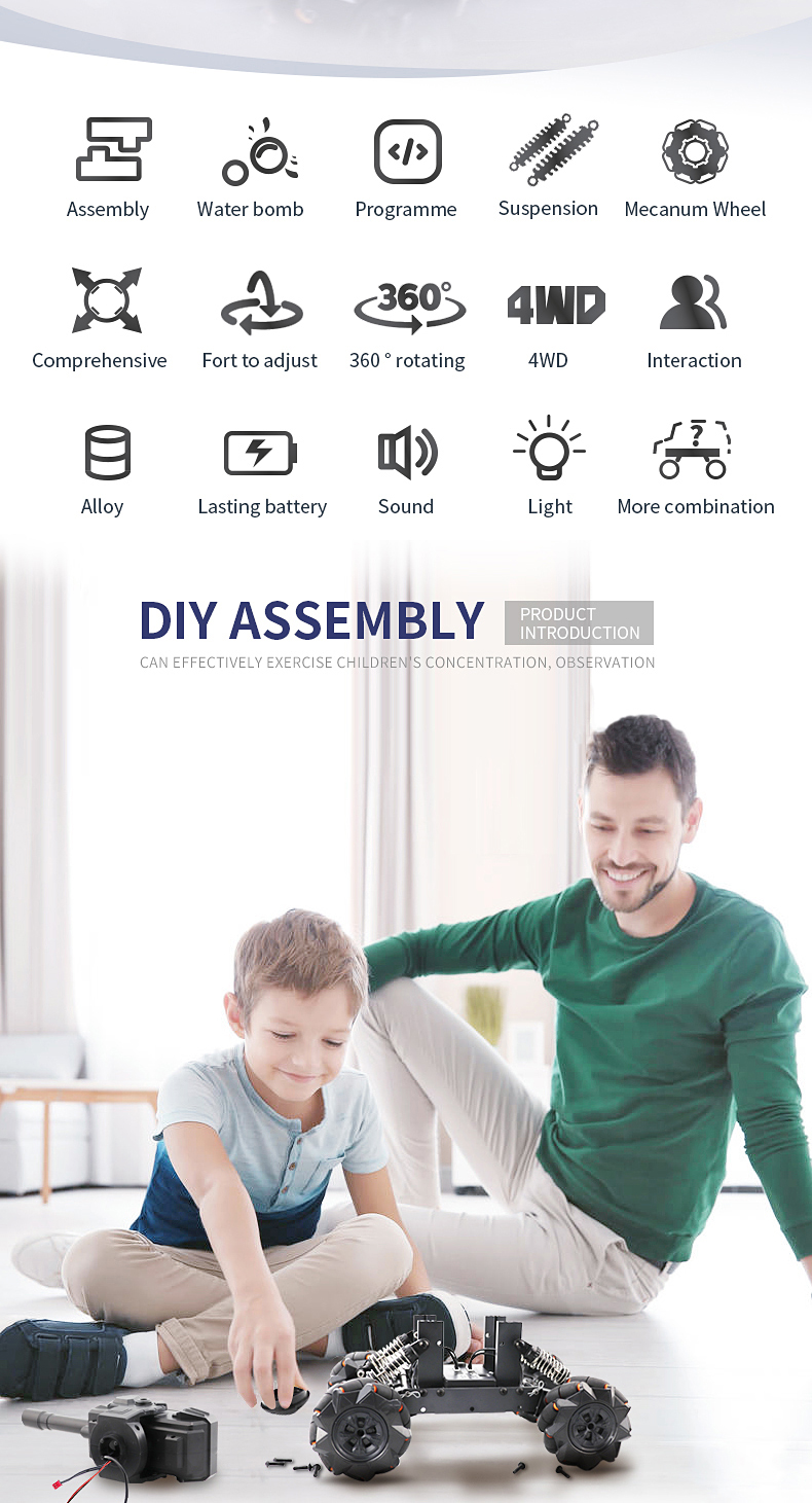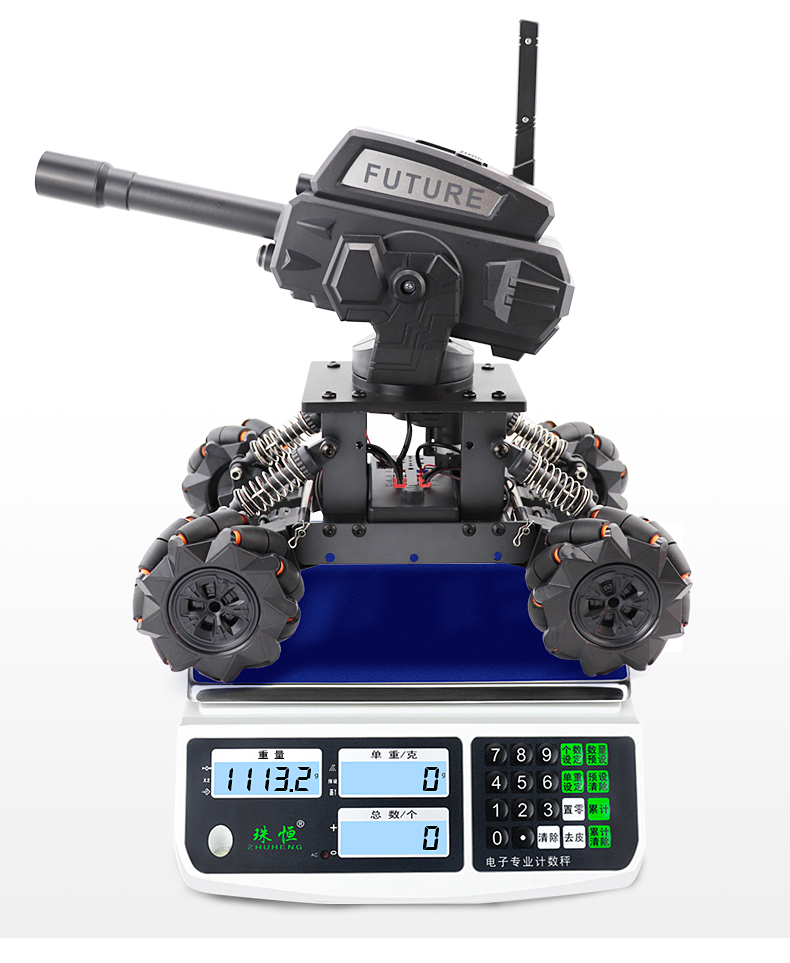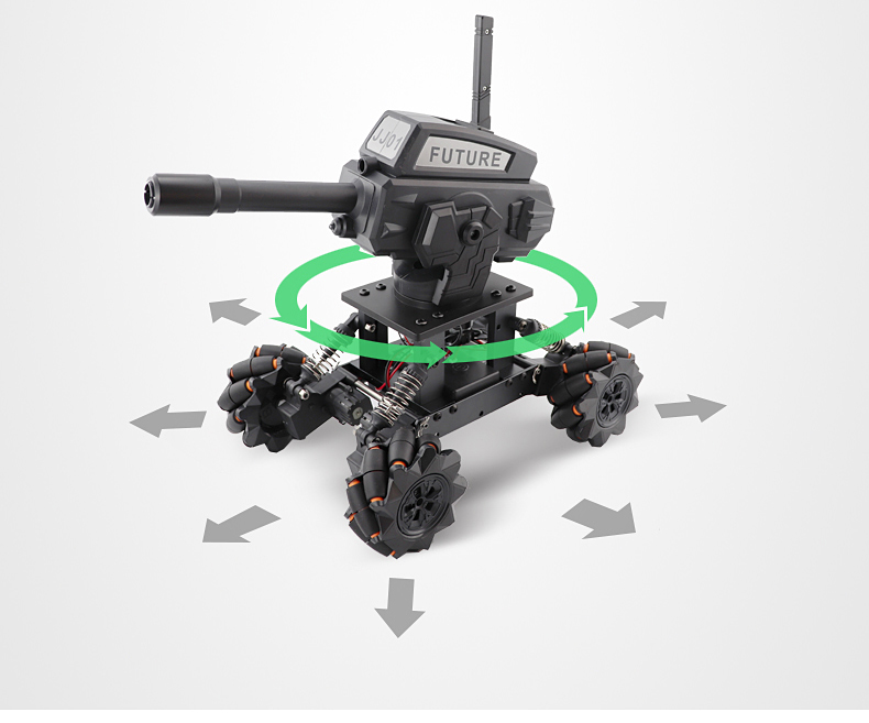 forward/backward,turn left/right,rotate,the turret rises/descends/360°rotation,shooting,with music and lights.