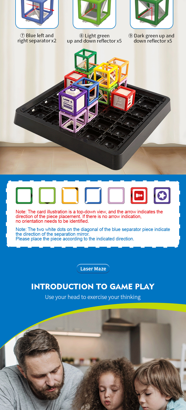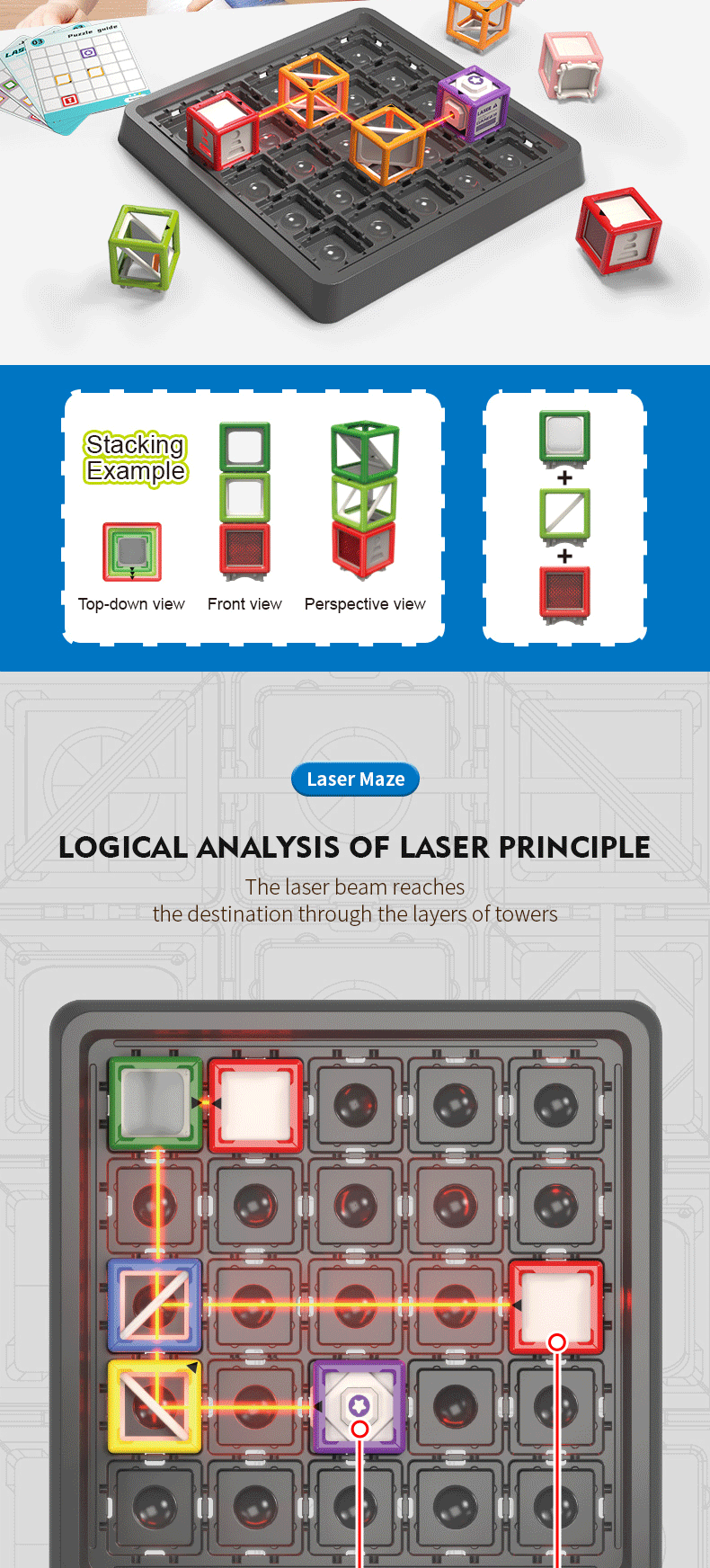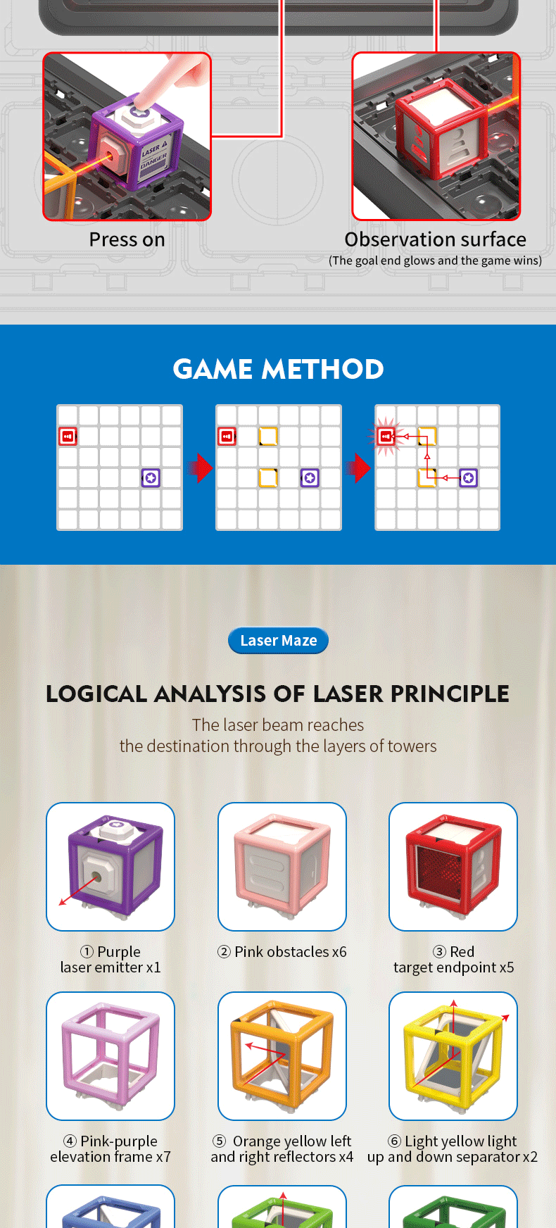 Guide the laser beam to the target through designed levels and hints. With 60 progressively challenging stages, the game expands from 2D to 3D, enhancing cognitive skills