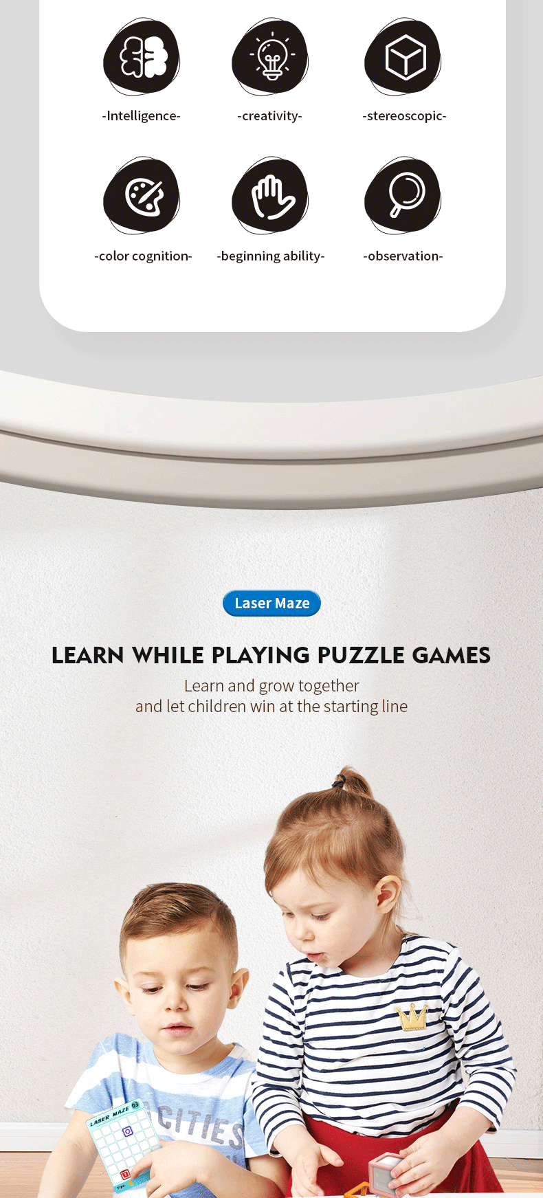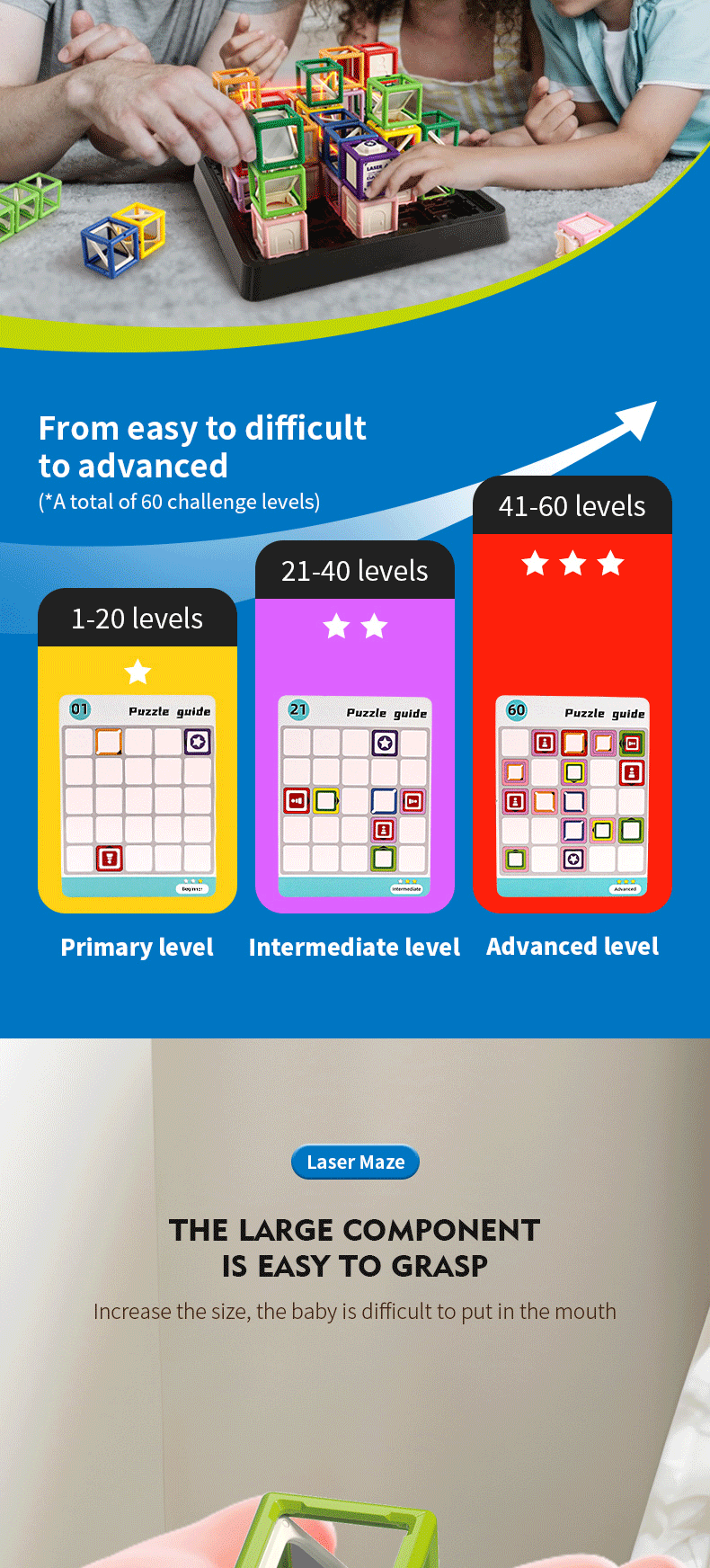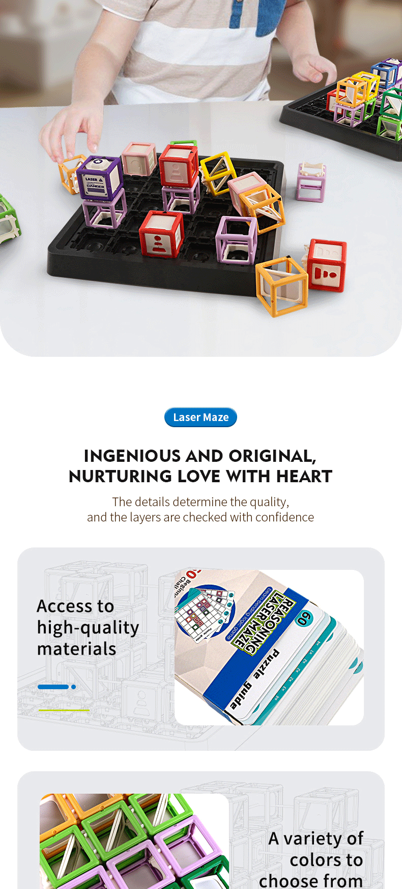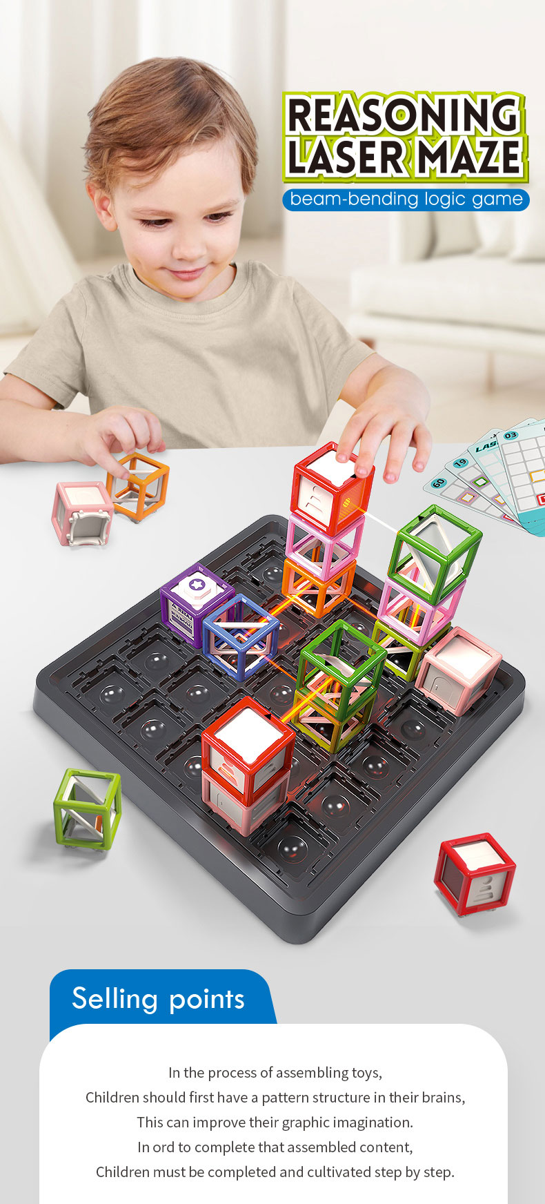 Guide the laser beam to the target through designed levels and hints. With 60 progressively challenging stages, the game expands from 2D to 3D, enhancing cognitive skills