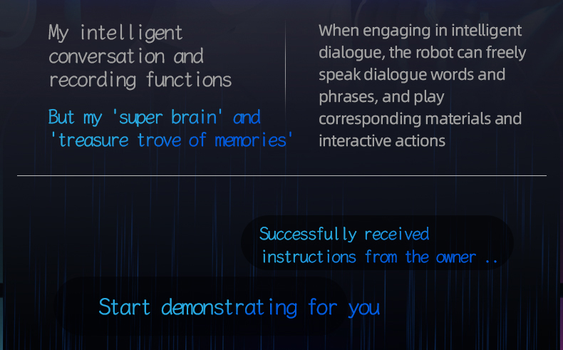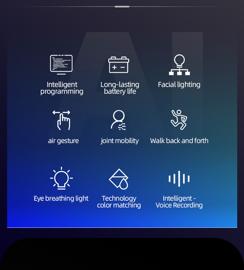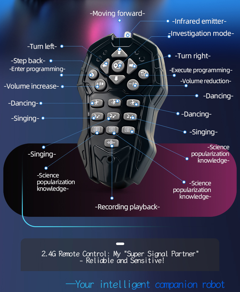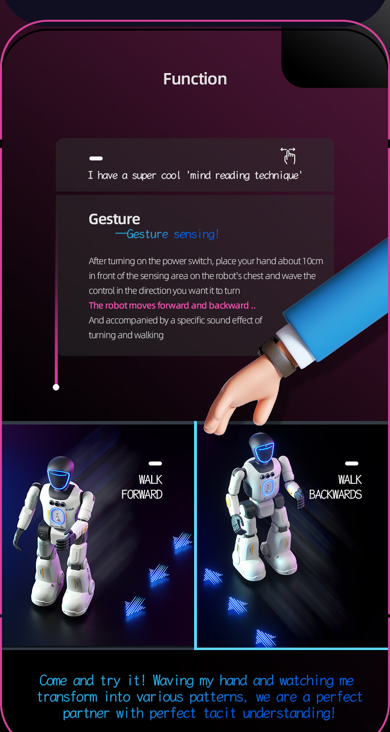 forward/backward, turn left/right, programming, dancing, singing, gesture control